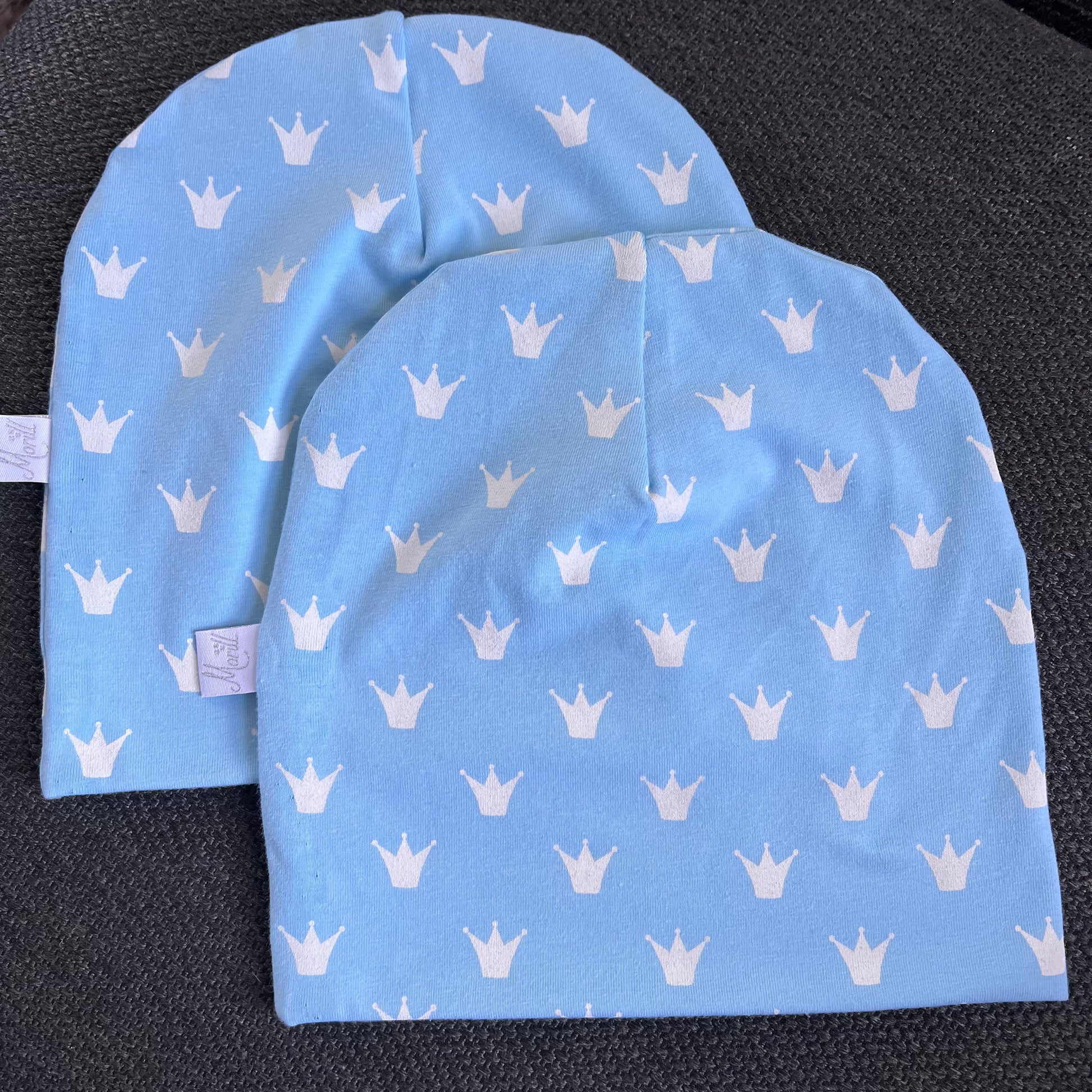 "Søt lue med kroner i dus blå, laget i dobbel bomull. Perfekt for små som elsker spennende design og komfort. Bestill nå!" Dobbel Bomullslue – Perfekt Passform for Allslags Bruk
