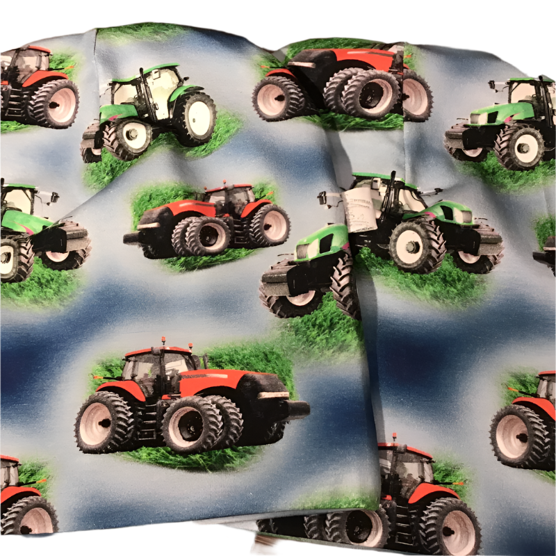 "Stilig lue med grønn og rød traktor på blå bakgrunn. Laget i myk bomull for varme og komfort. Perfekt for traktorentusiaster – bestill i dag!" Dobbel Bomullslue – Perfekt Passform for Allslags Bruk