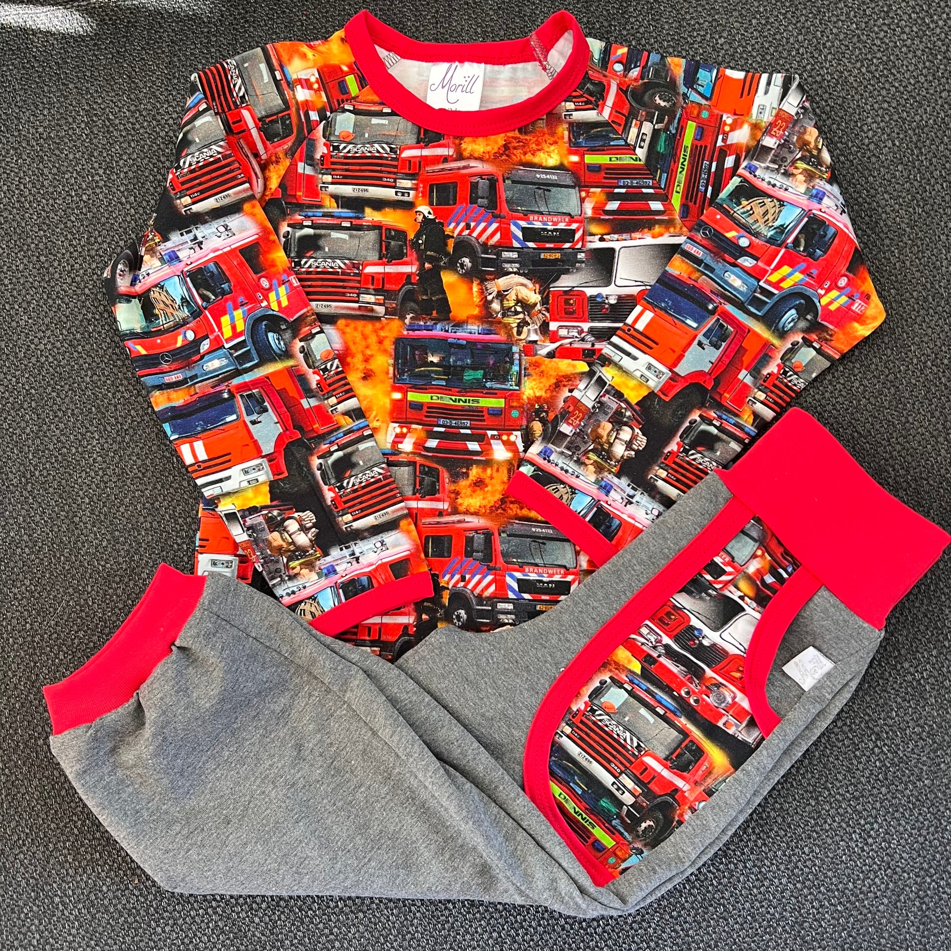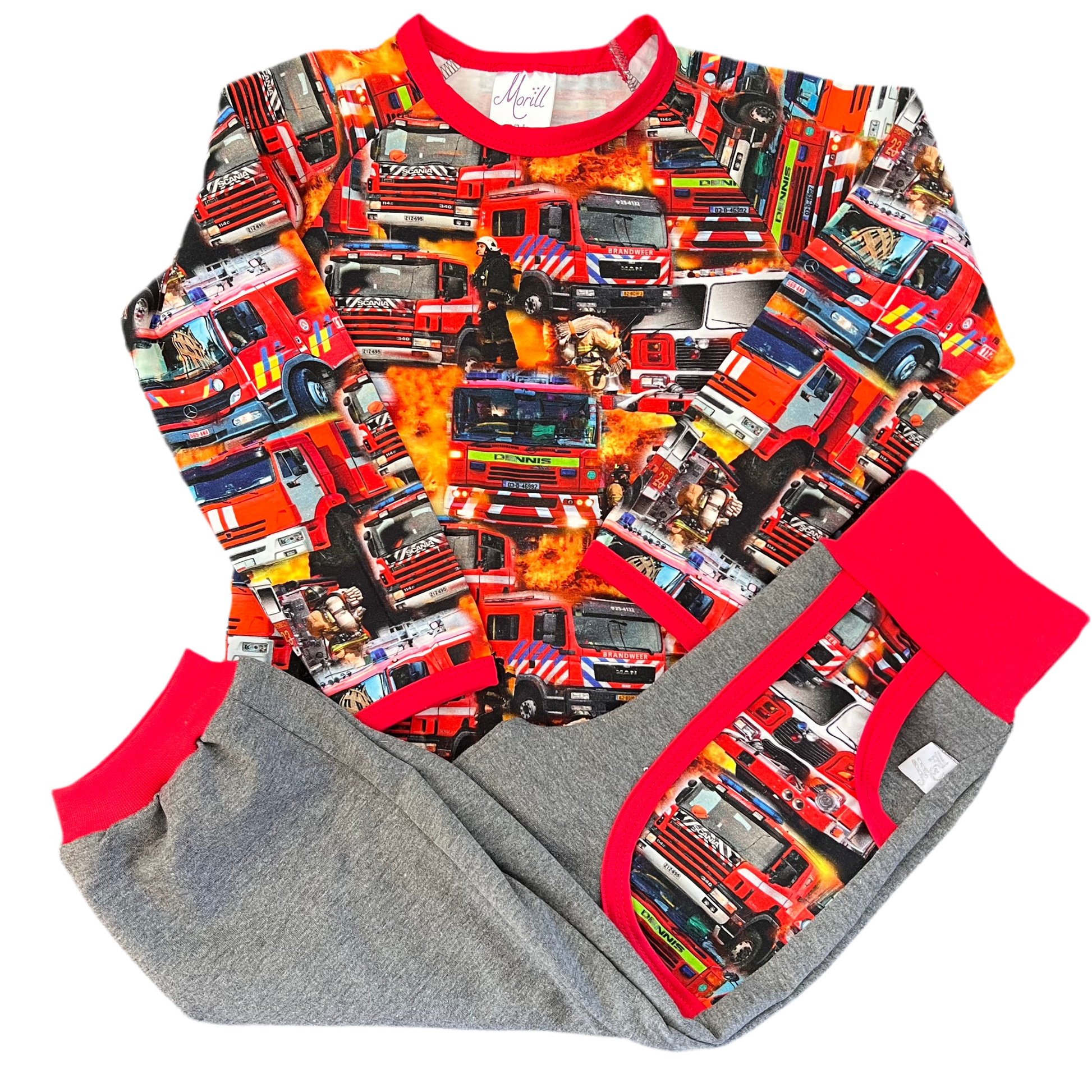 "Klassisk joggedress med røde brannbiler, perfekt til en fremtidig brannmann. Komfortabel og holdbar for lek og moro. Klikk for å kjøpe!" – Komfort og Bevegelsesfrihet for Aktive Dager