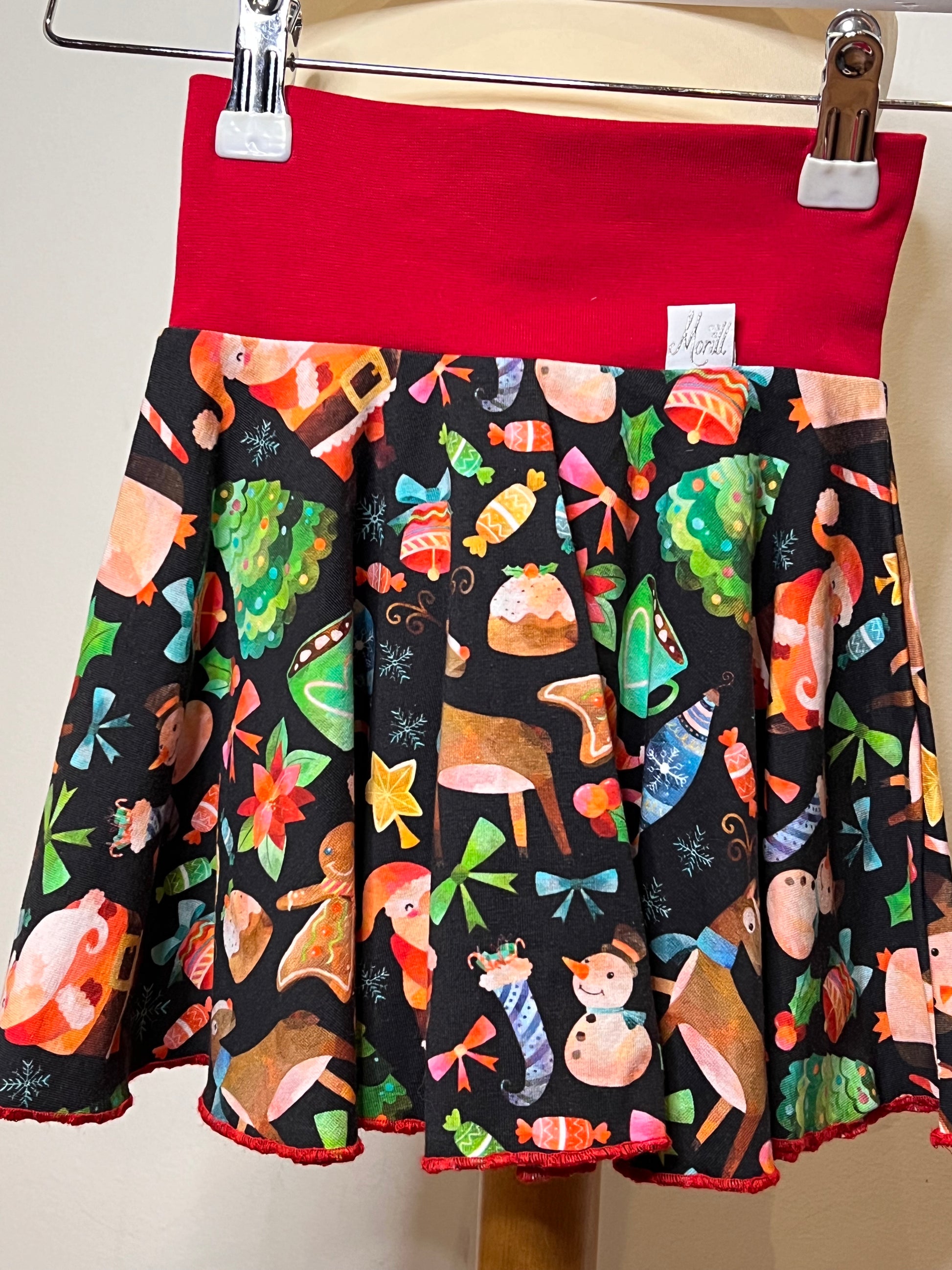 "Elegant juleskjørt med røde nissemotiv i full snurr. Komfortabelt og ideelt for små som elsker jul og bevegelse. Bestill nå!"