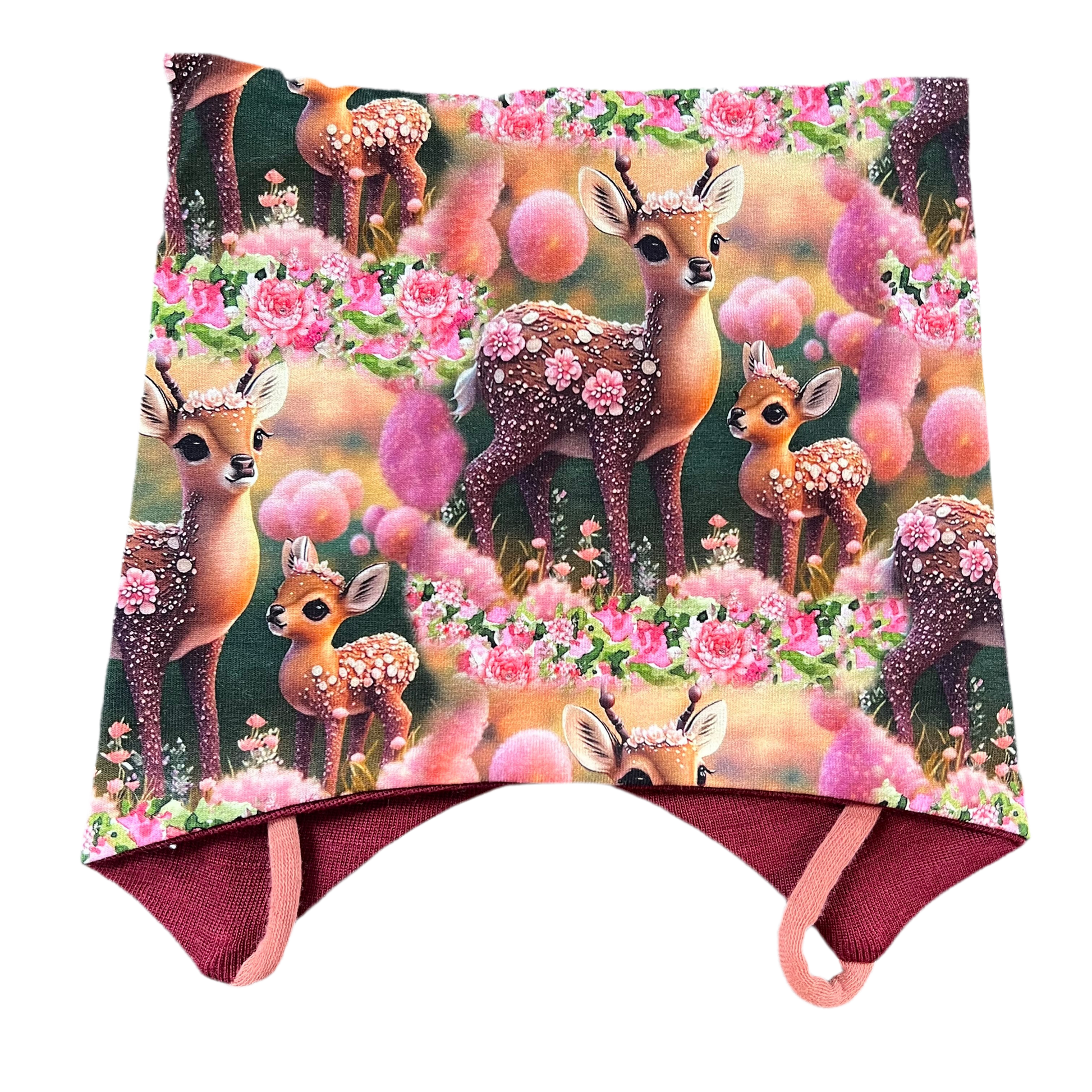 Knyttelue Rådyr og blomster m/ullfor. Ideell for små som elsker dyr og komfort. Hold varmen med stil – klikk for å kjøpe!" Knytteluer med Ullfôr – Varme og Beskyttelse for Små Hoder