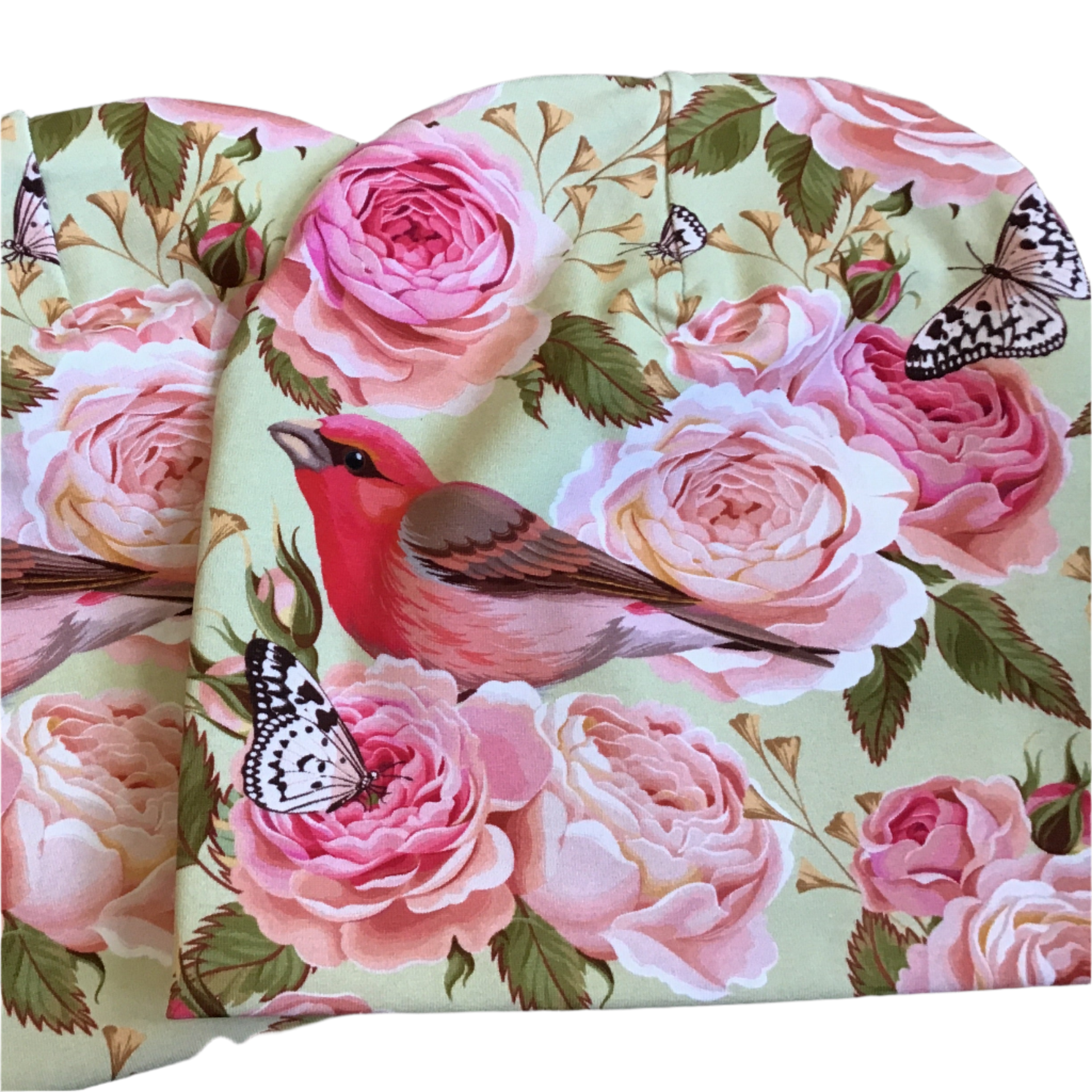 "Lue med delikate roser og rosa fuglemotiv i myk bomull. Perfekt for små naturentusiaster. Gjør dette til en favoritt – kjøp nå!" Dobbel Bomullslue – Perfekt Passform for Allslags Bruk