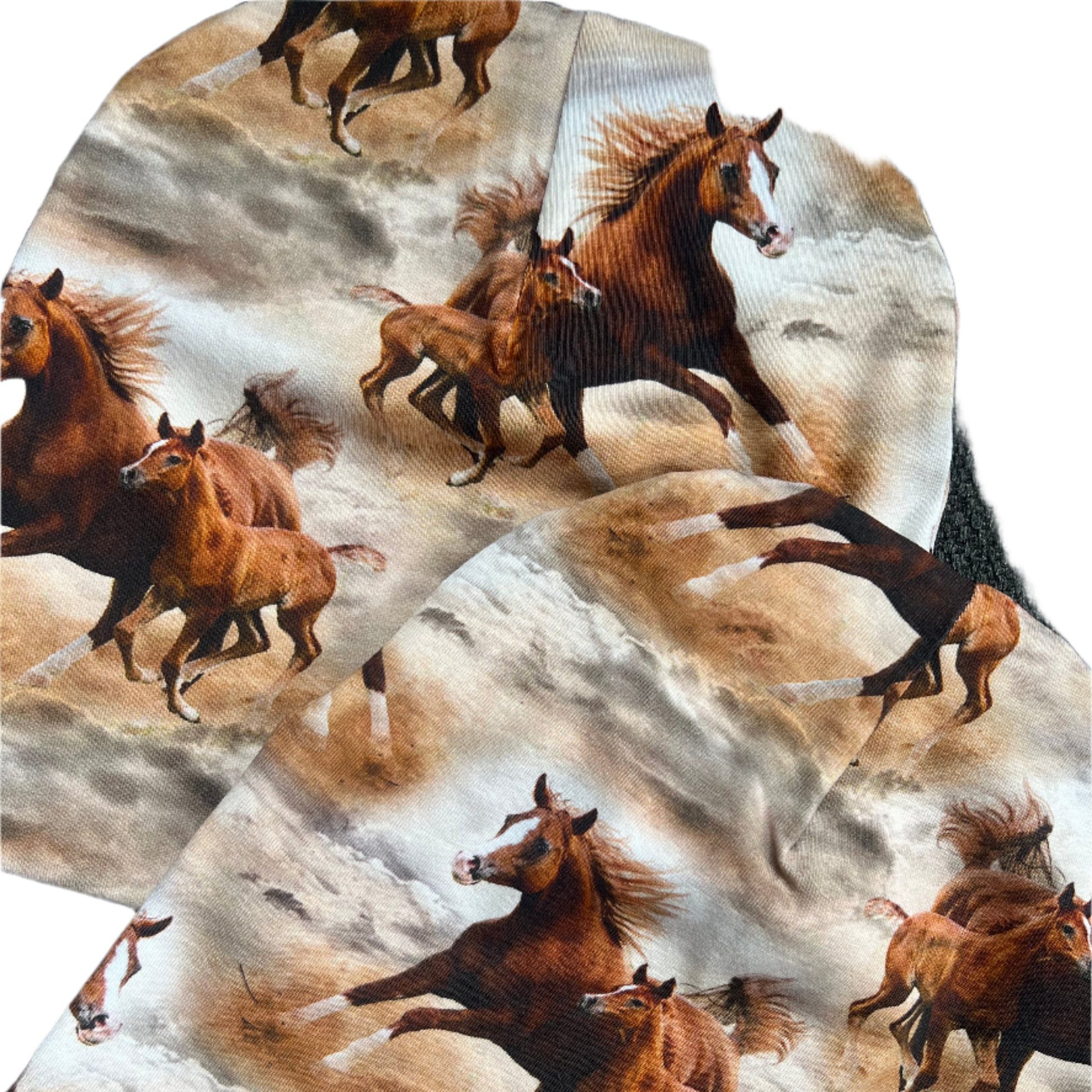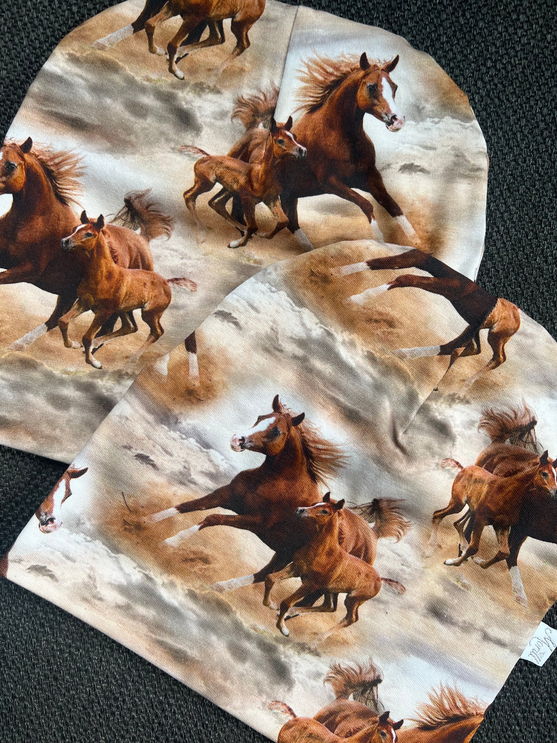 "Elegant lue med løpende hestemotiv i myk bomull. Perfekt for små som elsker natur og frihet. Legg til dette tidløse designet i garderoben!" Dobbel Bomullslue – Perfekt Passform for Allslags Bruk