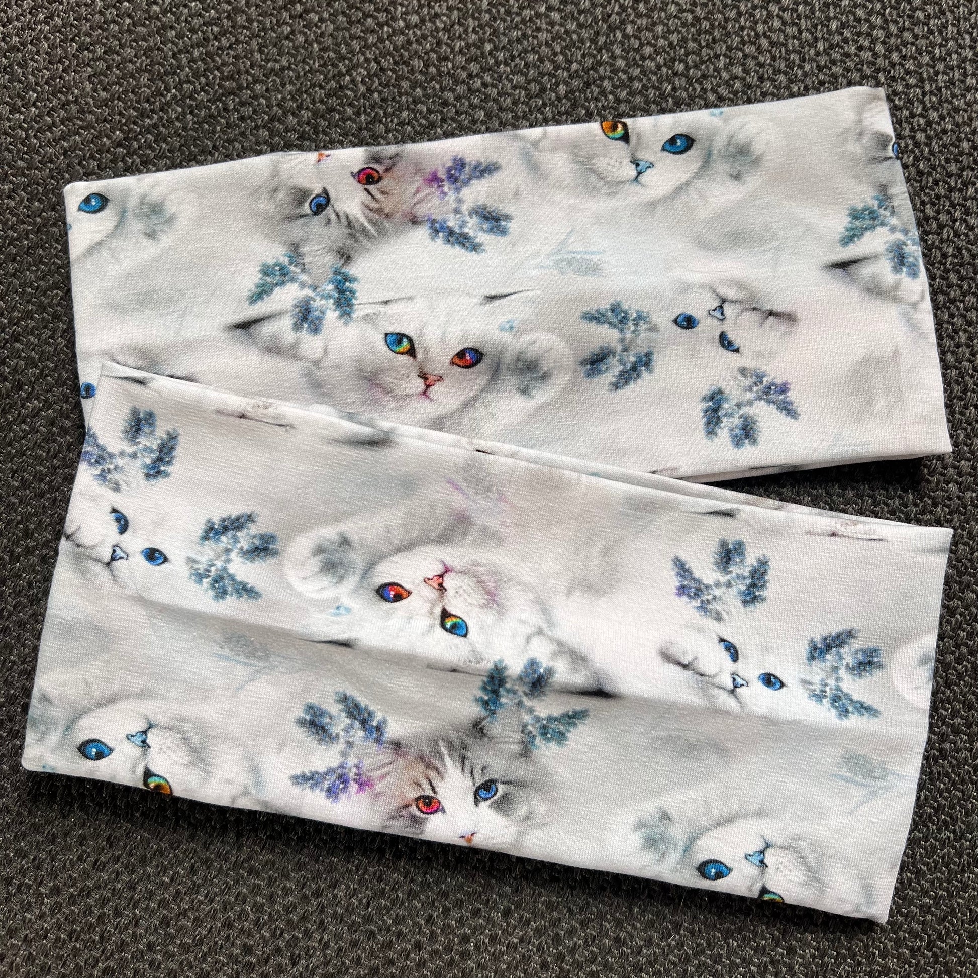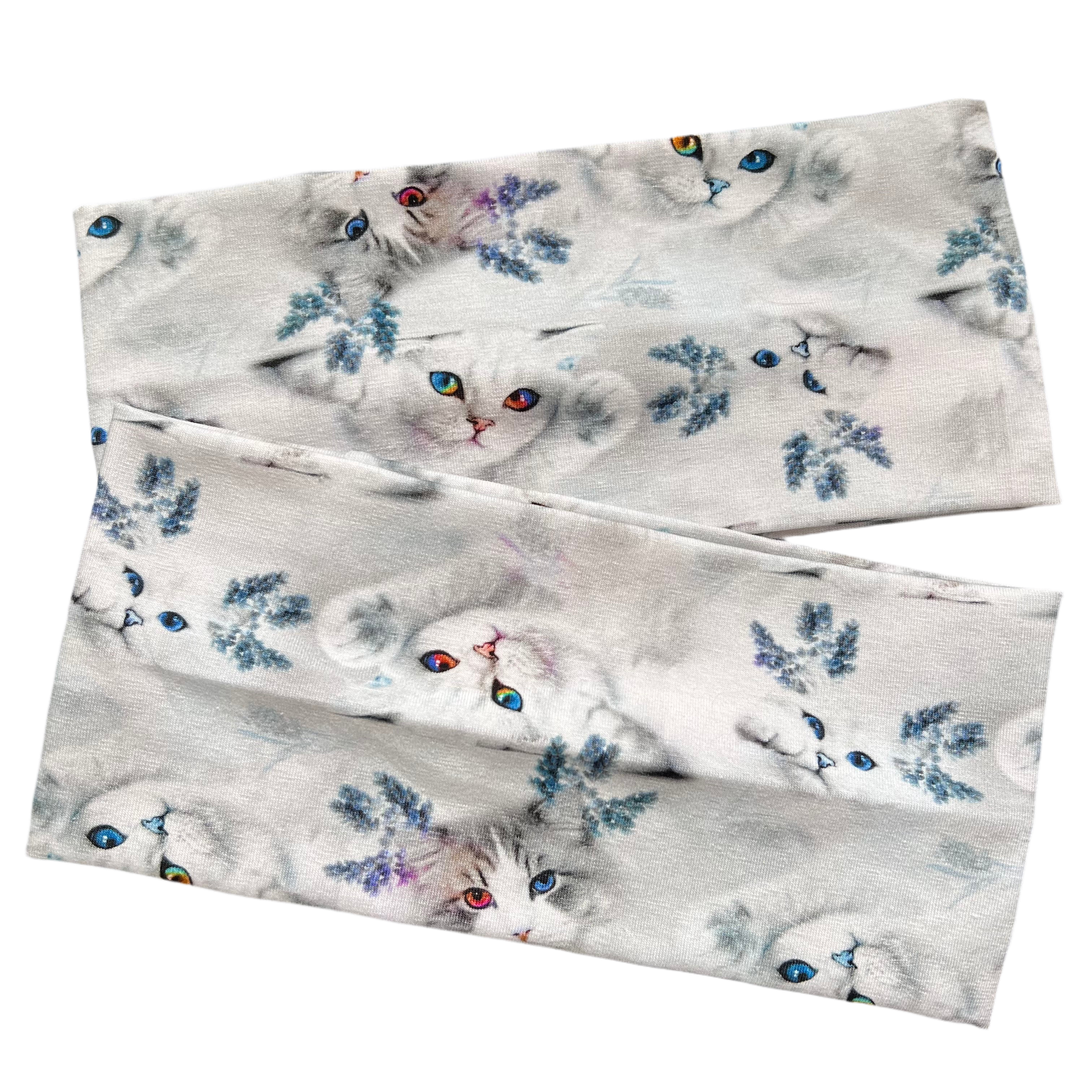 "Lekkert pannebånd med Hvite snøkatter i myk bomull. Elastisk og komfortabelt, ideelt for lek og hverdagsbruk. Kjøp din favoritt i dag!"Komfort, Stil og Beskyttelse for Kjølige Dager