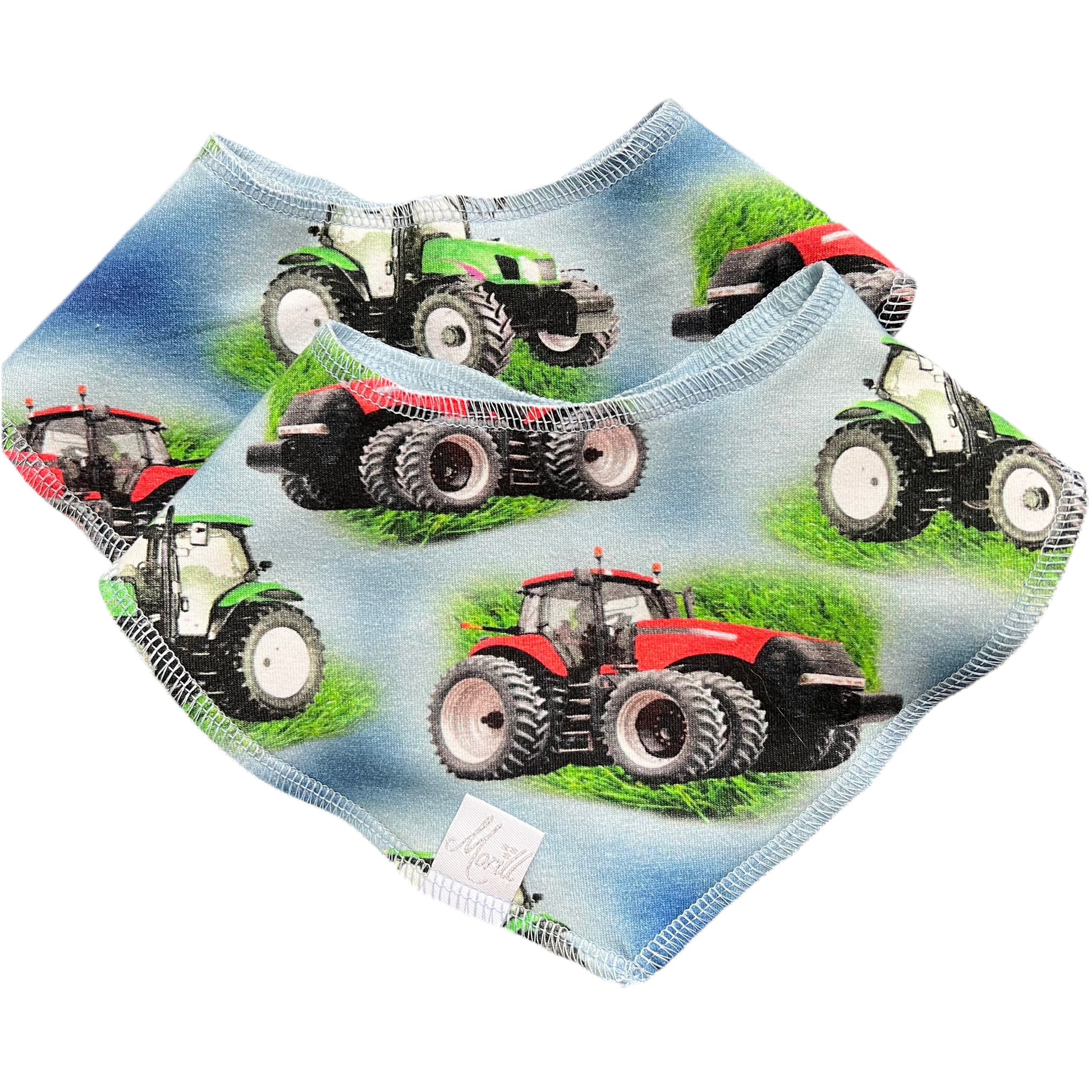 "Stilig smekke med blå med rød og grønn traktor. Myk smekke som beskytter mot søl. Sikre deg denne favoritten i dag!" Smekker – Praktisk og Dekorativt for de Minste