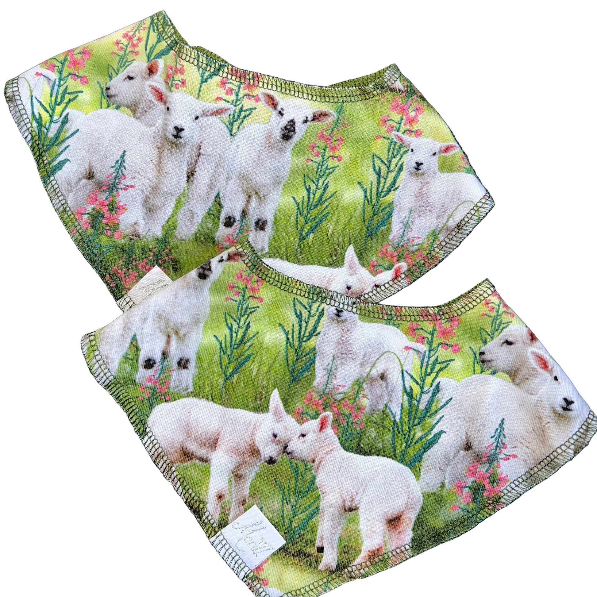"Praktisk smekke med Lam i eng, nydelig nå på våren. Mykt bomullsmateriale som beskytter mot søl. Sikre deg denne favoritten i dag!" Smekker – Praktisk og Dekorativt for de Minste