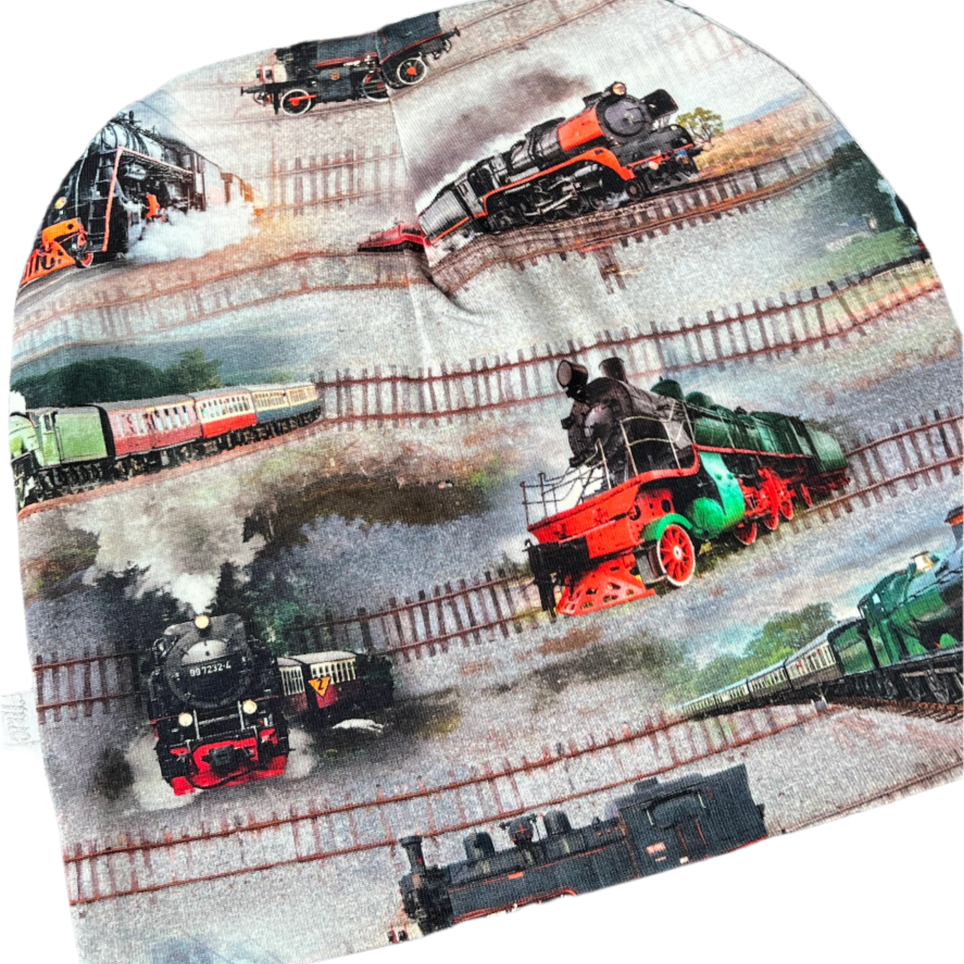 "Fargerik lue med togdesign, laget i myk bomull. Perfekt for små togentusiaster på kalde dager. Sikre deg denne lekne luen nå!" Dobbel Bomullslue – Perfekt Passform for Allslags Bruk