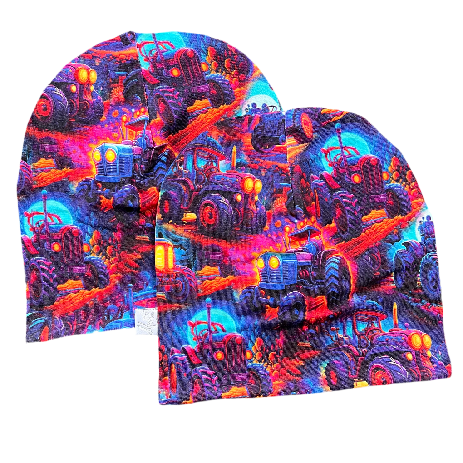 "Sjarmerende ull-lue med fargerike traktorer og varmt ullfor. Perfekt for små maskinfans. Legg til i handlekurven før den forsvinner!" Dobbel Lue med Bomull og Ull – Perfekt for Kalde Dager